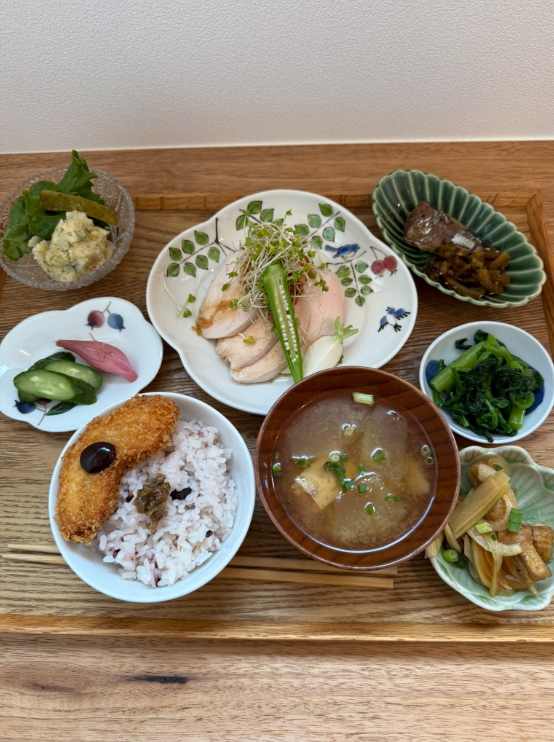 お料理は、ひとつひとつ丁寧に作られたお惣菜やお味噌汁、季節の素材を活かした小鉢など、体にやさしい和のお膳スタイル。主菜には鶏肉の低温調理や揚げ物、副菜には煮物・漬物・サラダなど、バランスの取れたメニューが並びます。雑穀米ごはんと、香り豊かなお味噌汁が心と体に染みわたり、「また来たい」と思わせてくれる優しい味わいです。